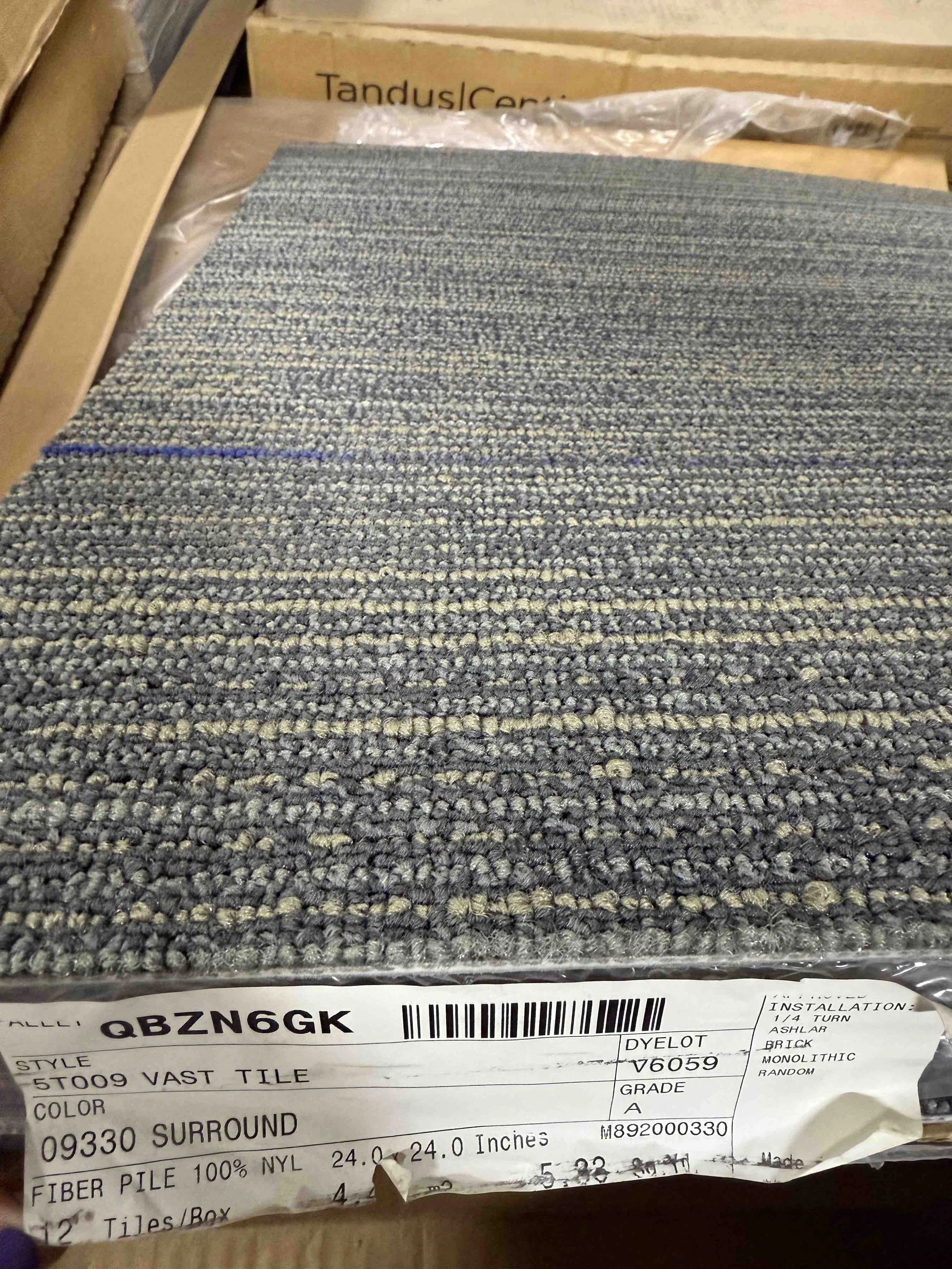 Store › 143.91 sqft of Carpet Tile Image 1 of 5 Image 2 of 5 Image 3 of 5 Image 4 of 5 Image 5 of 5 143.91 sqft of Carpet Tile $1.59 Shaw Contract 5T009 Vast Tile .Color: 09330 Surround Quantity: Add To Cart Added! Shaw Contract 5T009 Vast Tile .Color: 09330 Surround